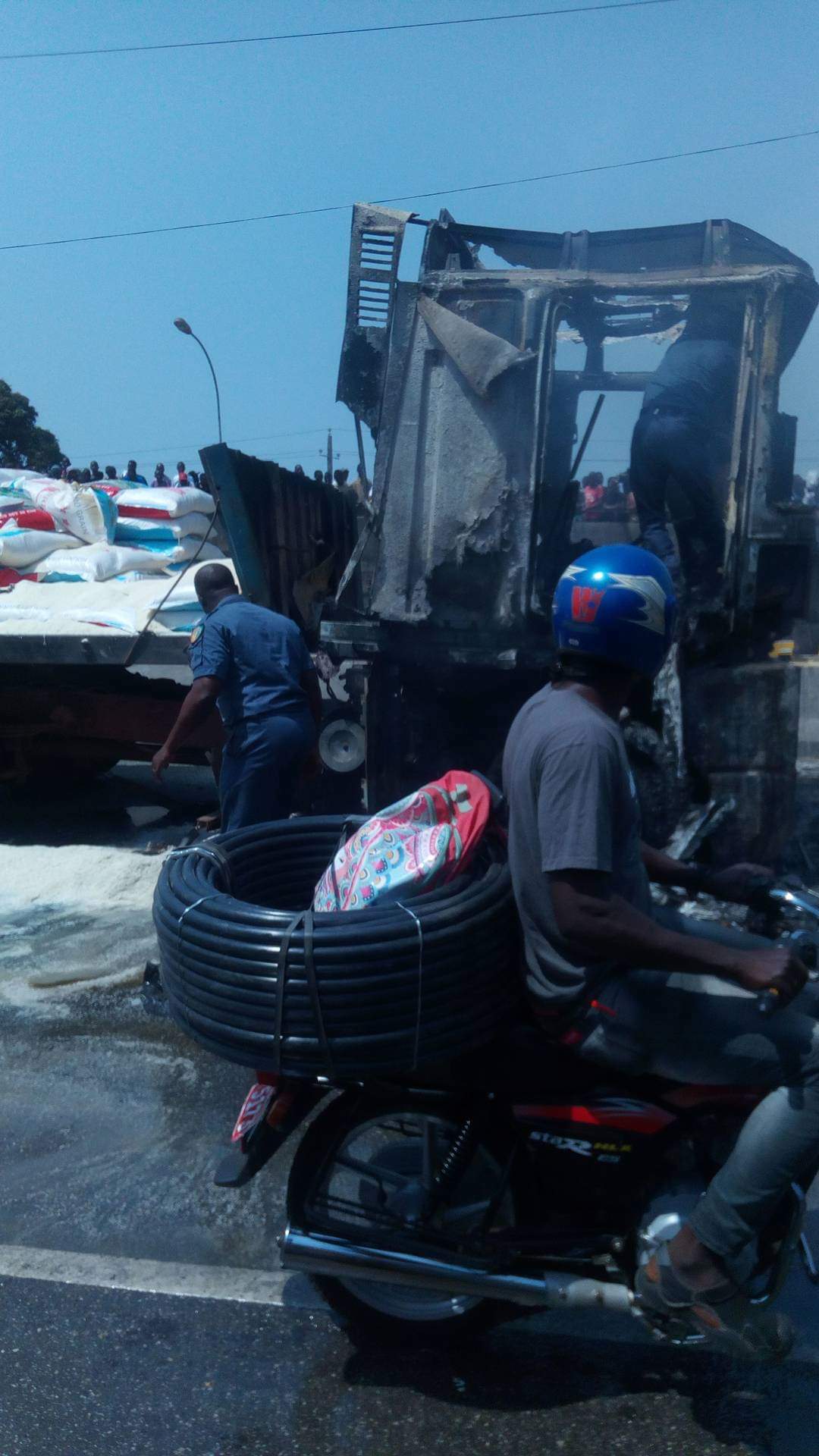 Il s’agit d’une remorque qui transportait des tonnes de riz en provenance du port autonome de conakry pour la haute banlieue. Pas de perte en vie humaine mais les dégâts matériels restent considérables. Jusqu’au moment où notre reporter quittait le lieu, aucune cause n’était encore élucidée pour circonscrire le drame.