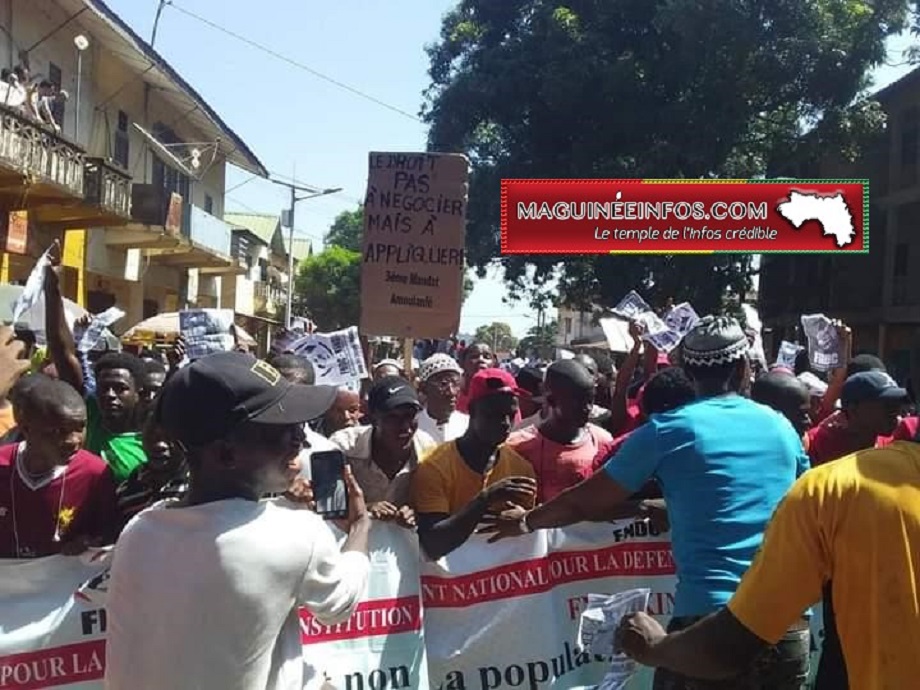 Munis de pancartes et de flyers, les opposants à tout projet de révision de la constitution ou de troisième mandat, ont marché en scandant des slogans comme « justice zéro » « libérer Sano et compagnie » « no à un troisième mandat ». Après une demi-heure de marche, La foule est arrivée à la place des martyrs comme prévu dans l’itinéraire défini par les autorités locales. À cet endroit, des discours ont été tour à tour prononcés par les leaders de l’UFDG, du FNDC et des femmes. Tous ont dénoncé les ambitions « déguisées » du pouvoir, La condamnation des activistes du FNDC et la tuerie des jeunes guinéens lors des récentes manifestations.