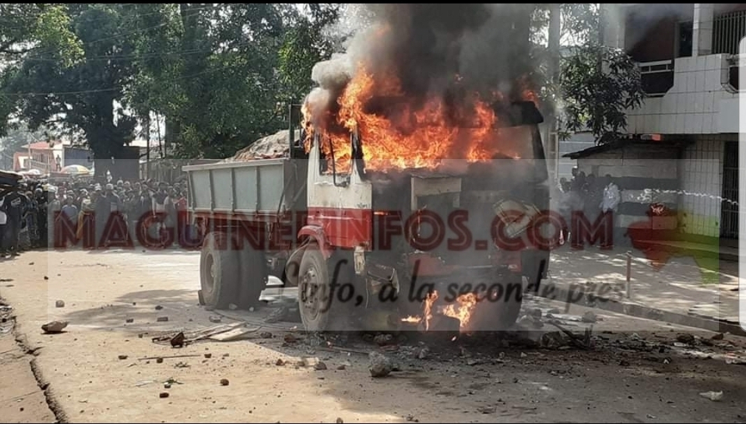 Il est 8 heures 40 minutes, juste quelques instants après l’accident mortel. Nous voici arrivé sur les lieux du drame. Le camion qui aurait écrasé le conducteur de taxi-moto est encore immobilisé. L’engin commence à être saccagé quelques minutes plus tard par une foule de conducteurs de taxi-moto. La tension monte et les collègues du défunt tiennent à incendié le gros porteur. « On doit brûler ce véhicule. Nos vies ne représentent rien devant leurs yeux. Ils ont qu’a allé à la contournante pour y circuler librement mais pas ici au centre-ville » nous dit un manifestant sous le coup de la colère.