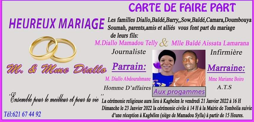Carnet Rose: célébration du mariage du Journaliste Diallo Tely et de Aissata Lamarana Baldé vendredi, 21 janvier 2022 à 23h:23 FacebookTwitterPinterestWhatsAppLinkedinE-mailPrintTumblr Le Journaliste Mamadou Tely Diallo et Aissata Lamarana Baldé se disent Oui! L’union du couple sera célébrée ce dimanche 23 janvier 2022 à la Mairie de Tombolia, suivie d’une réception à Kagbelein. Ci-dessous, la carte pour plus de détails!