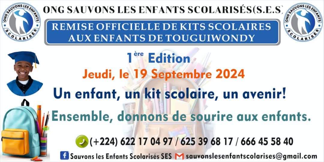 Événement: remise ce jeudi des kits scolaires aux enfants de Touguiwondy (S.E.S) mercredi, 18 septembre 2024 à 11h:11 FacebookTwitterPinterestWhatsAppLinkedinE-mailPrintTumblr L’ONG Sauvons le Enfants Scolarisés (S.E.S) dans son programme de soutien aux enfants défavorisés vous convie à la cérémonie de remise des kits scolaires aux enfants de Touguiwondy dans la commune de Matam. : : ̀ ̀ :